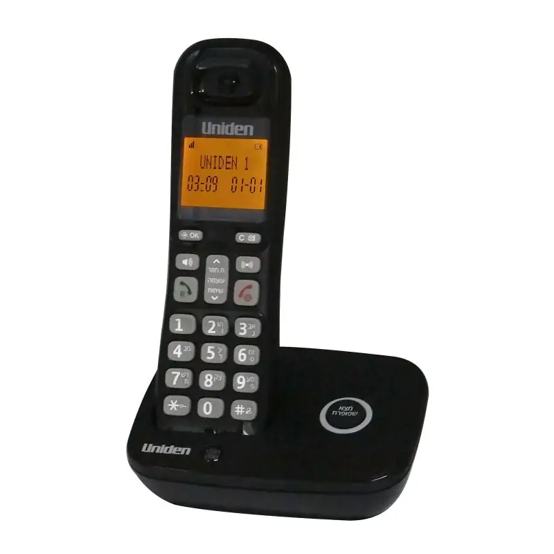 טלפון אלחוטי איכותי מבית Uniden, עם צג גדול מואר ומקשים גדולים מוארים- מתאים מאוד לבני הגיל השלישי. המכשיר כולל ספר טלפונים לעד 70 רשומות, מגוון אפשרויות צלצול לבחירה, זיהוי מתקשר מסך LCD עם תאורה, איכות שיחה גבוהה צלולה ונקייה.