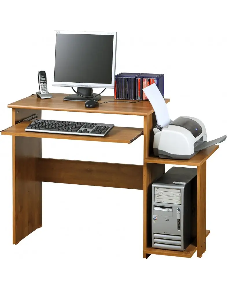 עם מגירת מקלדת ומעמד למחשב ומדפסת.
